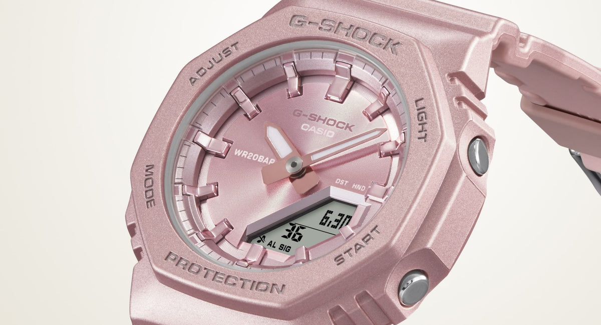 Introducing a new design maintaining the compact sizing and simple look characteristic of the GMA-P2100 series, but now featuring silky textural appeal in a lineup of three hues. Matte-finish pearlescent polarized coatings are applied to the bezel and band, while softly matted metallic colors are applied to the dial. The design featuring gentle coloration and subtle luster adds a look of elegance to the wrist.