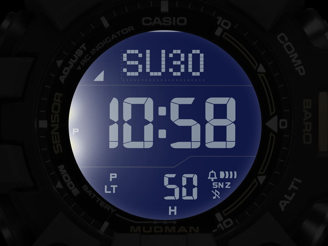 Designed to withstand extreme conditions, from rescue missions to wilderness survival, the MUDMAN has now evolved to incorporate a new construction and functions. While maintaining the original characteristic toughness of the dust- and mud-resistant structure, the new watch offers the slimmest profile possible, to deliver a highly comfortable fit. It also employs a dual-layer LCD to enhance the readability of the digital compass. In design and functionality alike, this MUDMAN is an embodiment of the practical utility needed to meet the demands of professional use.
